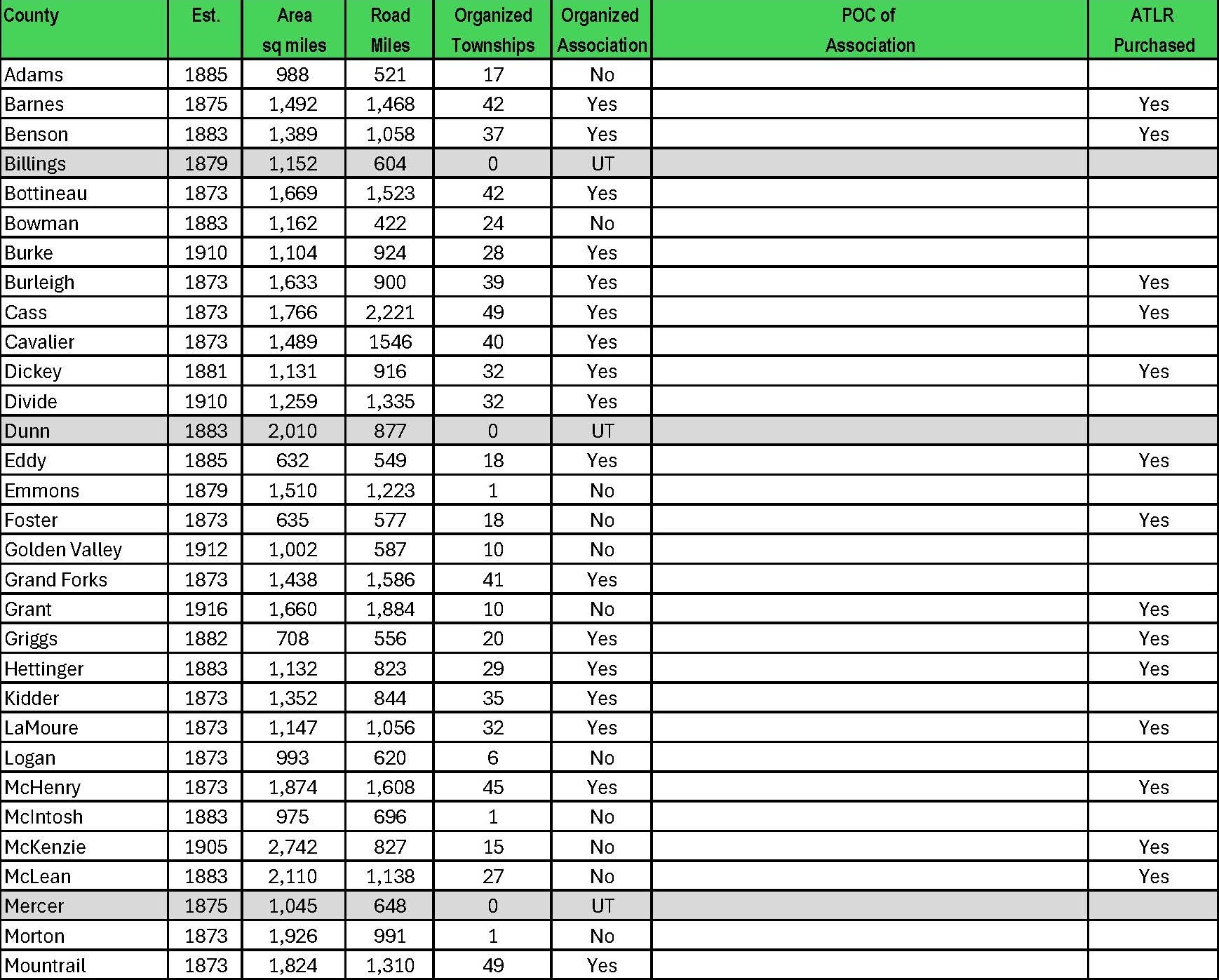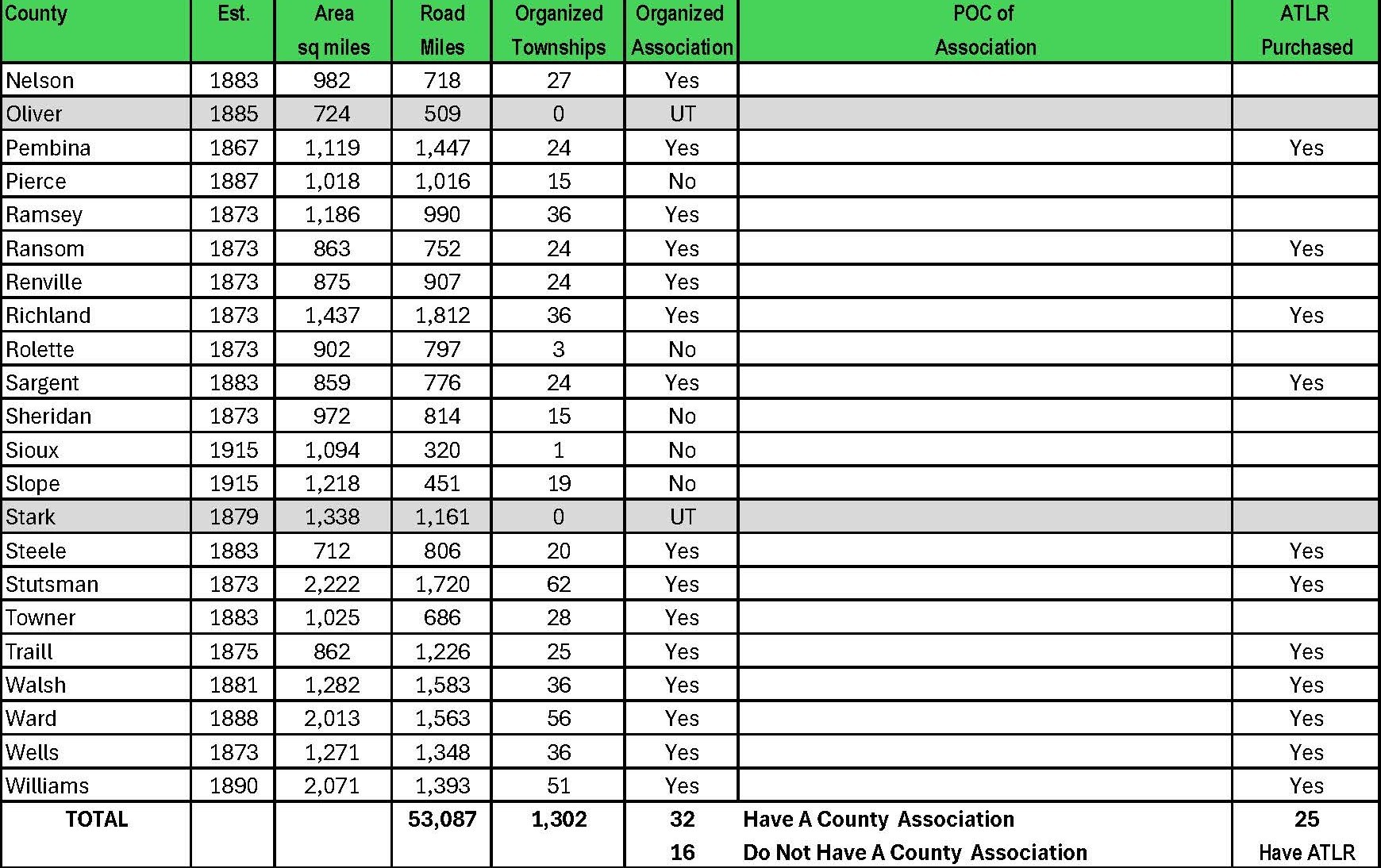 Listing of Counties indicating those that have organized township associations and those that have the Annual Township Ledger Report (ATLR) software for their townships to use.